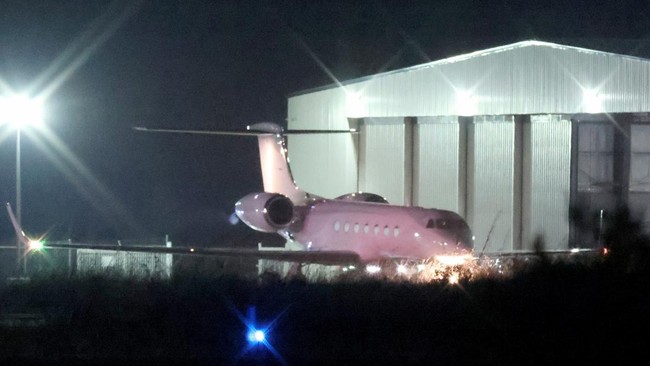 Sebuah pesawat terbang menuju landasan pacu di Odyssey Aviation dengan salah satu pendiri FTX Sam Bankman-Fried di dalamnya saat dia diekstradisi ke Amerika Serikat di Nassau, Bahama, Rabu (21/12/2022). (Joe Raedle/Getty Images)