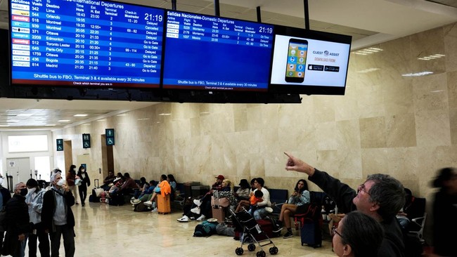Penumpang melihat papan informasi penerbangan di Bandara Internasional Cancun, Kanada, Senin (26/12/2022) waktu setempat.