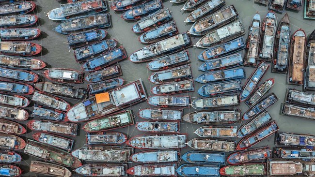 Foto aerial sejumlah kapal nelayan bersandar saat tidak melaut di Dermaga Muara Angke, Jakarta, Rabu (28/12/2022).