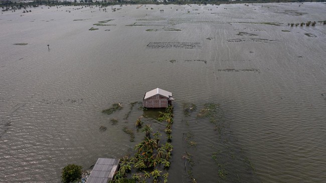 Foto udara sebuah rumah di sekitar areal persawahan yang terendam banjir di Desa Prampelan, Kecamatan Sayung, Kabupaten Demak, Jawa Tengah, Selasa (3/1/2023).