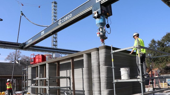 Texas - Sebuah bangunan dua lantai di Houston, Texas, AS, tengah dibangun dengan mesin cetak tiga dimensi atau 3D printer. Yuk kita lihat prosesnya.