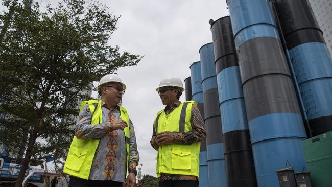 Dirut PT TASPEN (Persero) ANS Kosasih (kiri) berbincang dengan Dirut PT Taspen Properti Indonesia Bayu Setyo Utomo saat meninjau lokasi pembangunan Green Energy Superblock Oasis Central Sudirman di Jakarta, Selasa (31/1/2023).