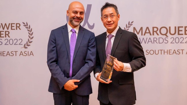 Direktur PT Indah Kiat Pulp & Paper Tbk Kurniawan Yuwono (kanan) bersama Siddiq Bazarwala CEO Alpha Southeast Asia seusai acara The 16th Annual Best Deal & Solution Awards 2022 di Mandarin Oriental Hotel, KLCC, Kuala Lumpur, Malaysia.