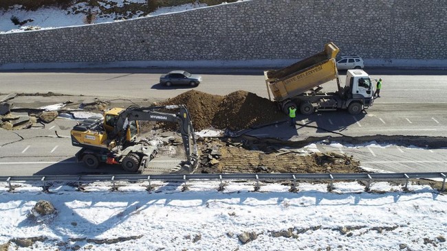 Turki - Jalan penghubung Adiyaman-Malatya Turki hancur diguncang gempa dahsyat. Kini jalanan itu mulai diperbaiki.