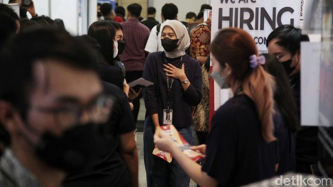 Jakarta - Para pemburu kerja memadati Mega Career Expo 2023 di Gedung Smesco, Jakarta, Jumat (24/2/2023). Mereka datang dari berbagai daerah.