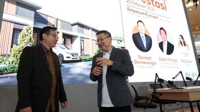 Chief Marketing Officer Kota Podomoro Tenjo Zaldy Wihardja bersama President Director Era Indonesia Darmadi Darmawangsa berbincang pasca acara Podcast Kota Podomoro Tenjo bertajuk Muda Melek Investasi di Main Atrium Emporium Pluit Mall Jakarta.