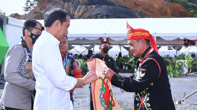 Gaya Jokowi Pakai Rompi Adat Saat Resmikan Groundbreaking PLTA di Kaltara