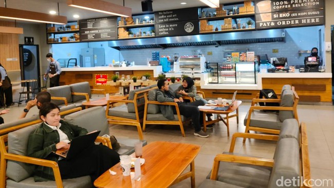 Sejumlah pengunjung beraktifitas di gerai Warunk Upnormal Bintaro, Tangerang Selatan, Senin (6/2/2023).