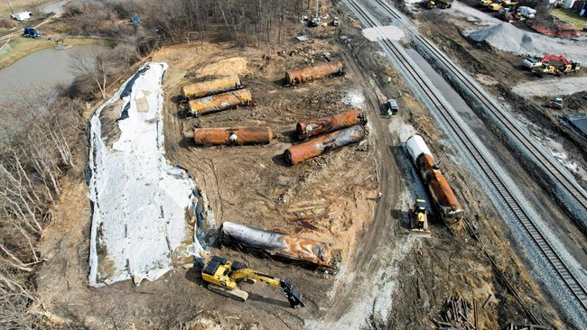 Amerika Serikat - Kereta yang mengangkut bahan kimia berbahaya tergelincir di East Palestine, Ohio, AS pada Februari lalu. Begini kondisi terkini kereta tersebut.