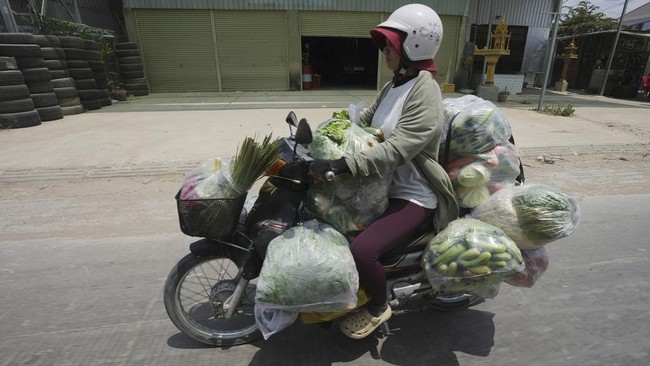 Seorang pedagang dengan sepeda motor membawa sayuran segar melalui jalan utama Phnom Penh, Kamboja, Kamis (16/3/2023).