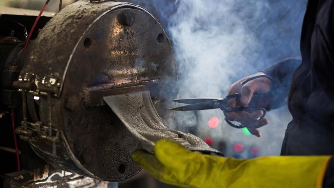 Seorang karyawan pabrik TileGreen bekerja di pabrik paving block ramah lingkungan di distrik Kota Ramadhan, barat laut Kairo, Mesir, Rabu (15/3/2023).