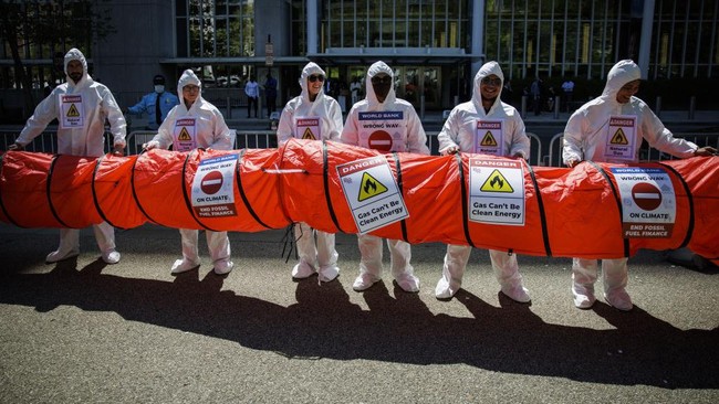 Washington - Aktivis di Washington menggelar demo di luar kantor pusat Bank Dunia. Mereka menuntut IMF untuk hentikan gas fosil.