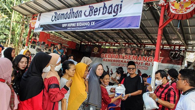 Jakarta - Badan Pengurus Pusat Himpunan Pengusaha Muda Indonesia membagikan sembako di Pasar Rebo, Jakarta. Kegiatan itu merupakan bagian dari program 'Ramadan Berbagi'.