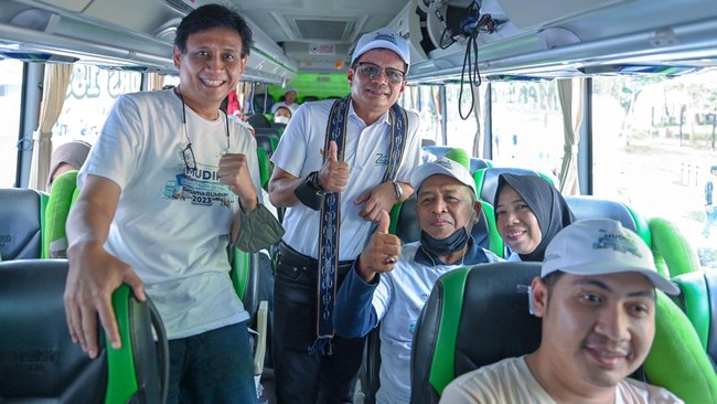 Direktur Utama SIG, Donny Arsal (kedua kiri) bersama peserta mudik, di dalam bus rute Jakarta menuju Surabaya saat acara Mudik Bersama BUMN 2023, di Gelora Bung Karno, Selasa (18/4).