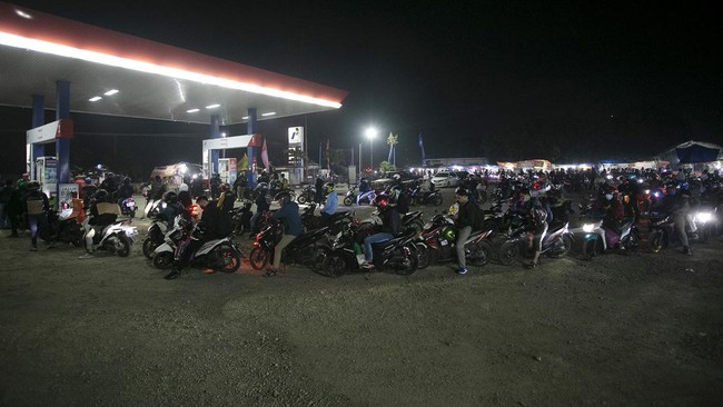 Potret Panjangnya Antrean Pengisian BBM Pemudik Motor di Indramayu