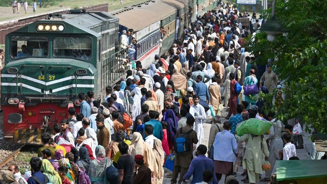 Pakistan - Kereta Api jadi salah satu transportasi pilihan warga Pakistan untuk mudik Lebaran. Penumpangnya bahkan sampai membeludak.