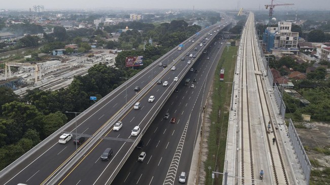 Foto udara sejumlah kendaraan melintas di Tol Jakarta-Cikampek dan Jalan Tol Layang MBZ di Tambun, Kabupaten Bekasi, Jawa Barat, Senin (1/5/2023).
