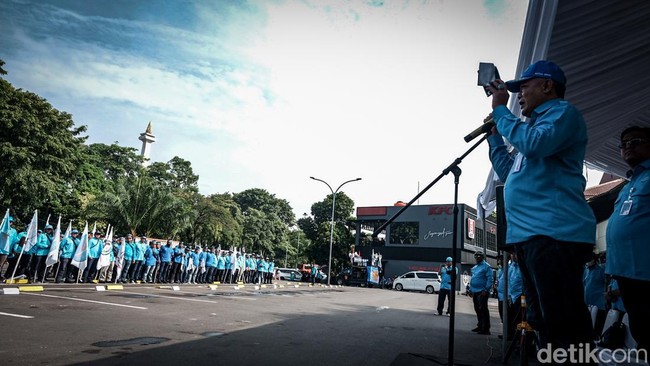Jakarta - Serikat Pekerja Kereta Api (SPKA) menggelar aksi damai di Stasiun Gambir, Jakarta Pusat. Aksi ini sekaligus memperingati hari buruh internasional atau May Day.