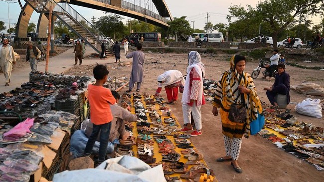 Orang-orang melihat-lihat alas kaki bekas yang dijual di bazar pinggir jalan di Islamabad, Pakistan, Selasa (2/5/2023). Inflasi tahun-ke-tahun Pakistan mencapai 36,42 persen pada April. Aamir Qureshi/AFP/Getty Images