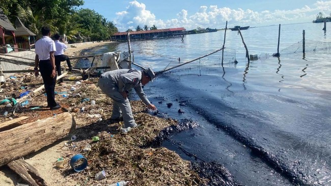 Batam - Bakamla RI mendapatkan laporan adanya tumpahan minyak hitam di Pantai Melayu, Batam. Bakamla pun langsung melakukan penanganan tumpahan minyak tersebut.