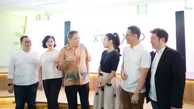 Direktur Consumer Banking CIMB Niaga Noviady Wahyudi (ketiga kiri) berbincang bersama Nasabah CIMB Niaga Sandra Dewi, Head of Marketing, Brand and Customer Experience Toni Darusman, Head of Preferred, Wealth and Insurance Business Ariteguh Arief, Head of Consumer Strategy & Partners Development Wijaya Handoyo Jo, dan Consumer Banking & Affluent Marketing Communication Head Deffy Lisa Hardjono saat Press Conference CIMB Niaga XTRA XPO 2023 di Jakarta.