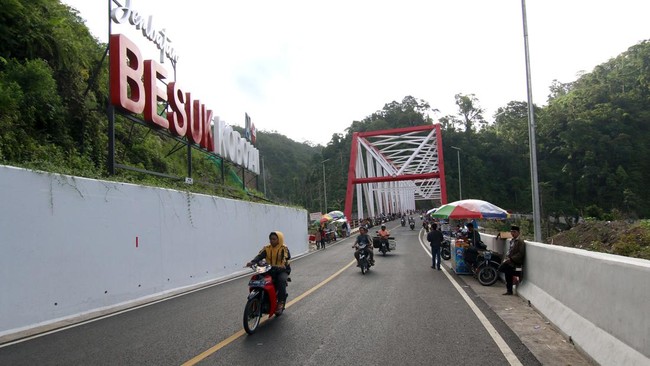 Lumajang - Jembatan penghubung Kabupaten Lumajang-Malang yang sempat terputus akibat terjangan material vulkanik Gunung Semeru kini sudah bisa dilintasi. Begini potretnya.