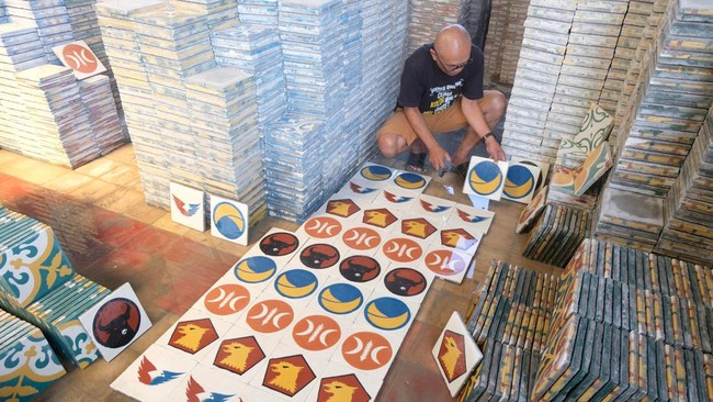 Magelang - Hajatan Pemilu 2024 dimanfaatkan oleh perajin tegel di Magelang, Jawa Tengah. Mereka membuat tegel bermotif logo partai politik.