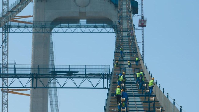 Nanjing - Proyek pembangunan Jembatan Sungai Longtan Yangtze, China sudah tahap akhir. Namun, pekerja masih terus kebut proyek pembanguan jembatan.