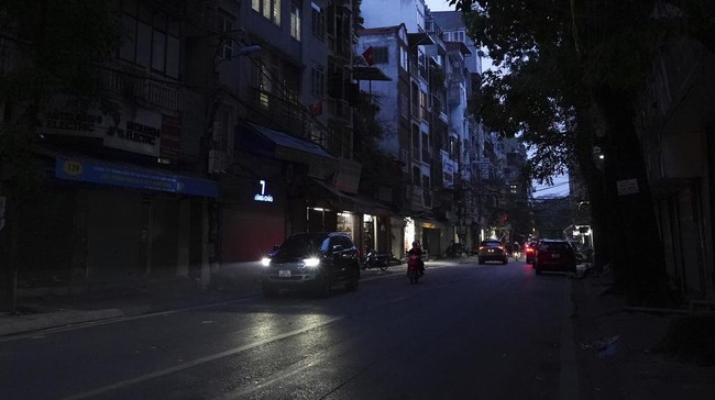 Lampu jalan terlihat dimatikan untuk menghemat energi di Hanoi, Vietnam, pada 8 Juni 2023. Pemadaman bergilir dan pemadaman listrik mendadak pun dilakukan. Hal ini menyebabkan kerugian "tak terhitung" di antara perusahaan lokal dan investor asing.