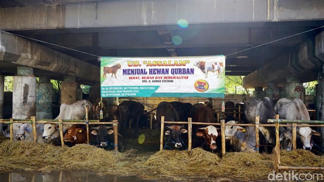 Jakarta - Kolong Tol Wiyoto Wiyono, Jakarta Utara, dijadikan sebagai lapak penjualan hewan kurban. Lapak itu selalu ramai oleh anak-anak yang ingin melihat hewan kurban.
