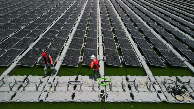 Tampilan udara menunjukkan pekerja dari Nofar Energy memasang panel surya di reservoir air di luar Kibbutz Or HaNer, Israel, Senin (19/6/2023).
