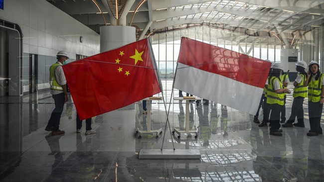 Bendera Indonesia dan China terpasang di lobi Stasiun Tegalluar, Kabupaten Bandung, Jawa Barat, Kamis (22/6/2023).