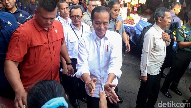 Jakarta - Presiden Joko Widodo (Jokowi) meninjau Pasar Palmerah. Di sela kedatangannya, Jokowi memberikan bantuan kepada para pedagang.