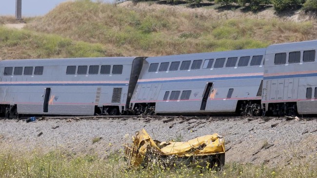 California - Sebuah kereta Amtrak yang membawa hampir 200 penumpang menabrak truk air county. Kereta tergelincir dan sopir truk dalam keadaan kritis.