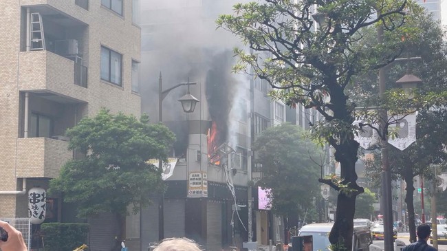 Rekaman video menunjukkan kobaran api dan kepulan asap menjulang dari lantai dua gedung yang ada di pusat Tokyo, Jepang, Senin (3/7) sore, sekitar pukul 15.20 waktu setempat. Twitter/@_Clockwork_666/REUTERS