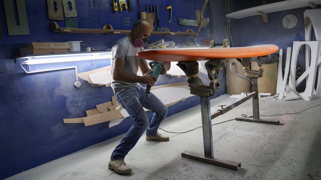 Paul Abbas tengah mengerjakan pembuatan papan selancar di bengkelnya di Halat, utara Beirut, Lebanon 26 Juni 2023.