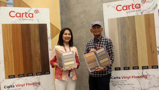 Shirley Sagita Antono, direktur dari PT. Prasetya Gema Mulia VIVERE Group, principal dari CARTA berbincang dengan Pulung Perangin Angin, CEO PT Gema Graha Sarana, Tbk, perusahaan induk VIVERE Group saat peluncuran vinyl flooring pameran material terbesar IndobuildTech Expo 2023 yang diselenggarakan di Indonesia Convention Exhibition (ICE BSD) Tangerang, Kamis 6 Juli 2023.