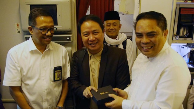 Direktur Sales & Distribution BSI Anton Sukarna (kanan) bersama Direktur Layanan dan Niaga Garuda Indonesia Ade R. Susardi (kiri) saat menyambut kepulangan rombongan jemaah haji Indonesia di penerbangan GA 983 yang mengangkut 281 jemaah di Terminal 3 Bandara Internasional Soekarno Hatta, Rabu (19/7).