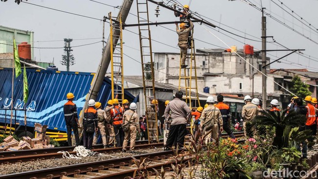 Jakarta - Tiang listrik arus atas (LAA) diperbaiki usai kecelakaan truk di lokasi. Kini, satu jalur rel Pondok Ranji-Kebayoran sudah bisa dilintasi KRL.