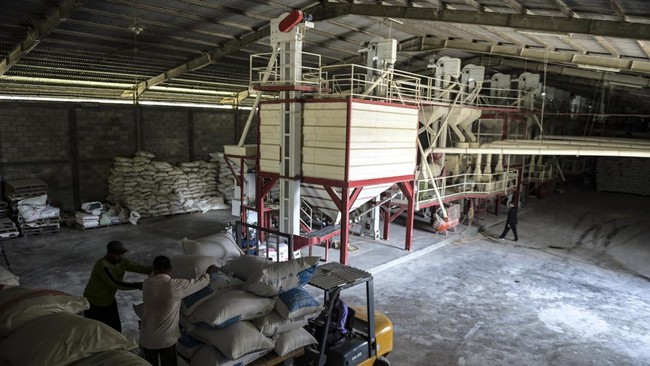 Pekerja mengangkut beras menggunakan kendaraan alat berat di Istana Beras Pondok Pesantren Al Zaytun, Indramayu, Jawa Barat, Kamis (27/7/2023).