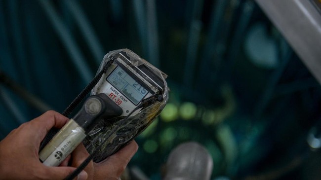 Peneliti memantau reaktor nuklir menggunakan alat ukur radiasi gamma di reaktor nuklir Triga 2.000 di Badan Riset Inovasi Nasional di Bandung, Jawa Barat, Kamis (3/8/2023).