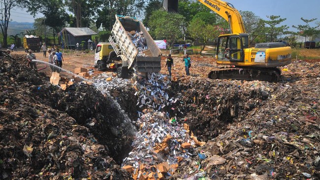 Petugas menggunakan alat berat untuk memusnahkan rokok ilegal di Tempat Pembuangan Akhir (TPA) Tanjungrejo, Kudus, Jawa Tengah, Jumat (4/8/2023).