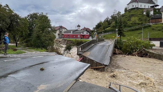 Slovenia - Banjir yang disebabkan hujan deras di Slovenia memutuskan sebuah jembatan. Begini potretnya.