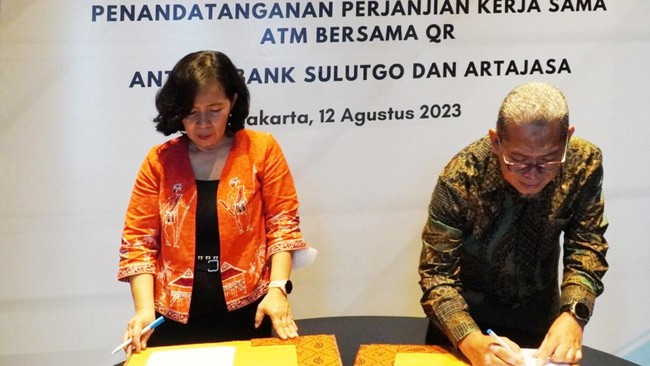 Direktur Operasional Bank SulutGo Louisa J. Parengkuan (kiri) bersalaman dengan Direktur Bisnis Artajasa Heru Perwito (kanan) saat Penandatanganan Perjanjian Kerja Sama Layanan ATM Bersama QR (Quick Response) antara PT Bank Pembangunan Daerah Sulawesi Utara dan Gorontalo dengan PT Artajasa Pembayaran Elektronis,di Jakarta.