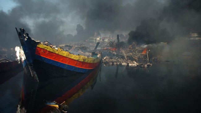 Tegal - Kebakaran kapal nelayan di Pelabuhan Jongor, Tegal, Jawa Tengah, meluas. Total ada 61 kapal yang terbakar.