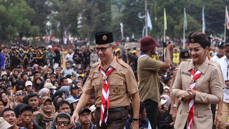 Ketua Dewan Komisioner OJK Mahendra Siregar (kiri) bersama Kepala Eksekutif Pengawas Perilaku Pelaku Usaha Jasa Keuangan, Edukasi, dan Perlindungan Konsumen OJK Friderica Widyasari Dewi (kanan) menyapa peserta pramuka saat acara Kreasi Bangkit di Buperta, Cibubur, Jakarta, Minggu (20/8/2023).