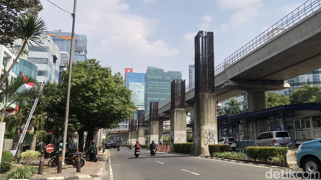 Berdasarkan pengamatan detikcom, Selasa (22/8/2023), salah satu bekas peninggalan proyek mangkrak itu terletak di Jalan Rasuna Said, Kuningan, Jakarta Selatan.
