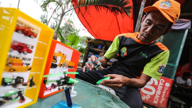 Jakarta - Seorang petugas Unit Pengelola Sampah (UPS) Badan Air Dinas Lingkungan Hidup (DLH) DKI Jakarta menyulap limbah korek gas menjadi kreasi unik berupa miniatur.