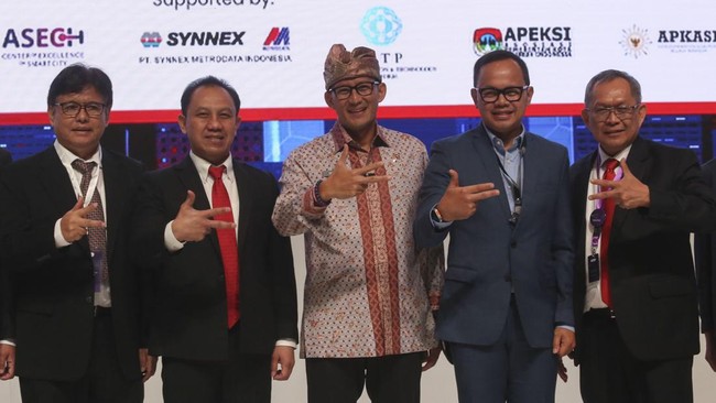 Menteri Pariwisata dan Ekonomi Kreatif Sandiga Salahudin Uno (tengah) bersama (dari kiri) Komisaris Utama PT Industri Telekomunikasi Indonesia (Persero) (INTI) Unggul Priyanto, Direktur Utama Edi Witjara, Wali Kota Bogor yang juga Ketua Umum Asosiasi Pemerintah Kota Seluruh Indonesia (APEKSI) Bima Arya Sugiarto dan Direktur Operasi Ahmad Taufik berfoto bersama saat acara International Smart City Conference 2023 dengen tema “The Design of Indonesia : Creating a Connected and Smart Future” di Jakarta, Selasa (12/9/2023).