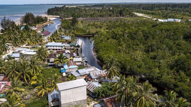 Desa Kampung Baru terletak di pinggir lokasi pembangunan Kalimantan Industrial Park Indonesia (KIPI) (kanan), di Mangkupadi, Kalimantan Utara, Kamis (24/8/2023). Kawasan industri sedang dibangun di Indonesia di pulau tropis Kalimantan yang telah menarik investasi asing dan domestik bernilai miliaran dolar.